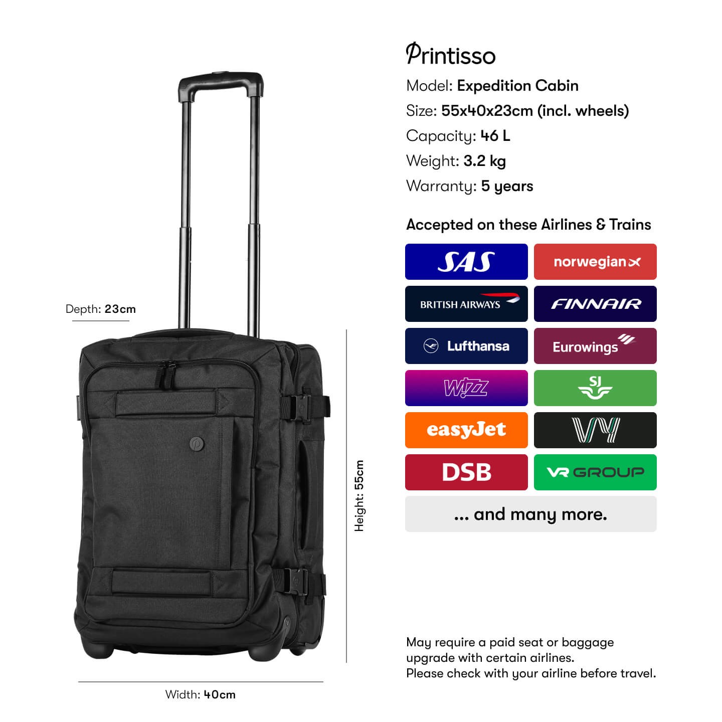 Printisso Expedition kabinetui og rygsæk er designet til eventyrlystne, der værdsætter fleksibilitet og alsidighed, med mulighed for både at rulle og bære deres bagage på ryggen. Rejsekufferten er lavet af slidstærkt og vandafvisende materiale med 5 års omfattende garanti. Kufferten har flere forskellige ydre lommer til en organiseret og smart pakning. Der er en større forlomme, der blandt andet kan rumme en computer op til 15 tommer med to forskellige inderlommer, der lukkes med lynlås. Der er også en mindre forlomme, der åbnes fra siden til pas, mobil, nøgler og andre personlige tilbehør. Kuffertens dybde kan også let justeres ved hjælp af de to robuste spænderemme. Rejsekufferten rulles let på to hjul med teleskophåndtaget. Derudover har kabinekufferten skjulte rygsækremme, der kan trækkes frem, så kufferten kan omdannes til en rygsæk. Beskyttelse til hjulene forhindrer snavs på tøjet, når rejsekufferten bæres som rygsæk. Kabinekufferten er perfekt til en kortere rejse på 1-4 dage og er også velegnet til både tog- og bilrejser.