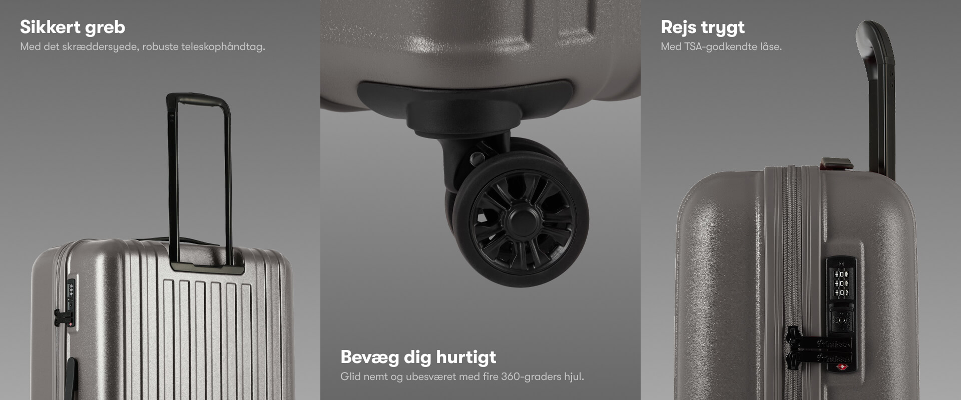 Tasken har en indbygget, trecifret TSA-kodelås for en sikker rejse. Bemærk venligst, at TSA-nøgler er forbeholdt toldvæsenet, og IKKE medfølger kufferten. Lynlåsens skydere er designet således at de er godt beskyttet mod stød.