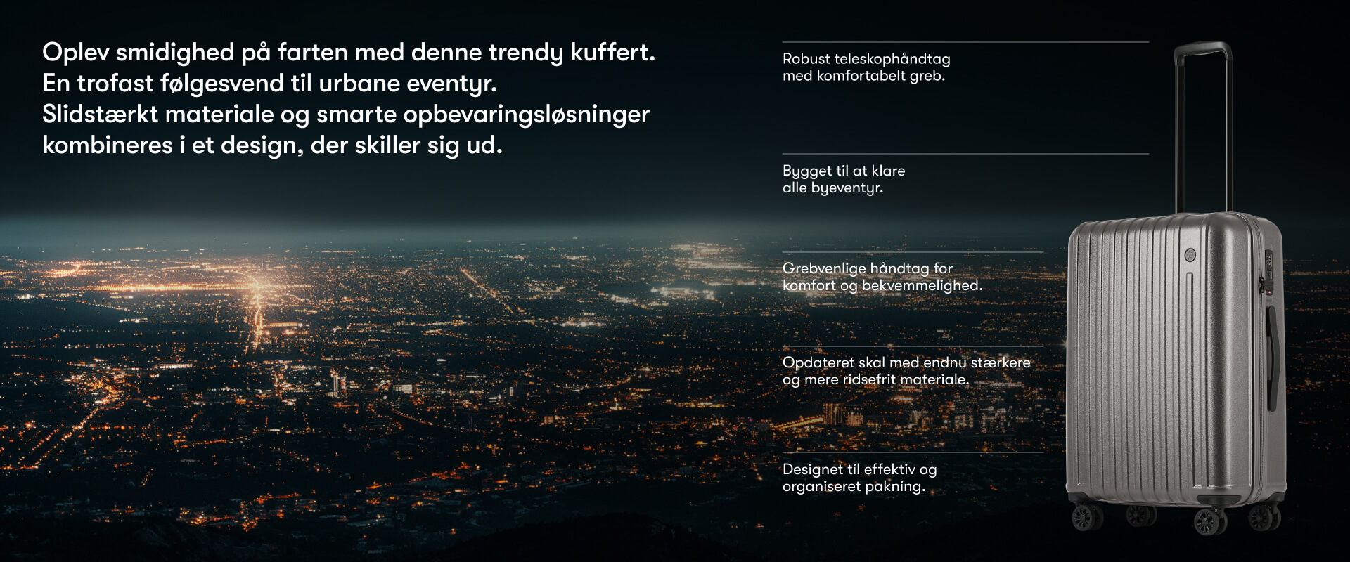 Printisso Urbane er en kuffert til dig, der leder efter en let, slidstærk og stilren medium kuffert, som sagtens kan holde til lidt af hvert. Urbane er fremstillet i et hårdt, let og slidstærkt materiale, der garanterer en lang levetid med 5 års omfattende garanti. Kuffertens design er tidløst med hjørner, som er specielt designet til at give dig den maksimalt tilgængelige pakkevolumen og beskyttelse mod stød. Urbane-serien kommer i 10 smagfulde farver. Dagdrøm om din næste rejse med den stilrene kuffert i farven Graphite Grey. Kuffertens dimensioner er designet således at den kan tjekkes ind hos alle flyselskaber. Den er perfekt til en rejse på 4-7 dage, men er også velegnet til både tog- og bilrejser. Kufferten leveres i en smart dustbag, som beskytter den under transport og opbevaring.