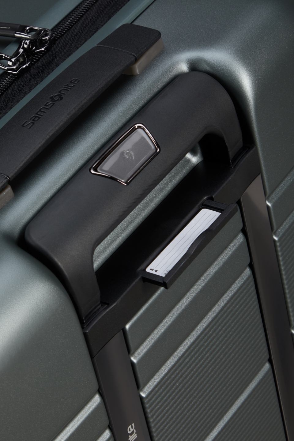 Kabinekufferten har et smart teleskophåndtag på toppen samt håndtag på både øverste og side, der sikrer nem håndtering.