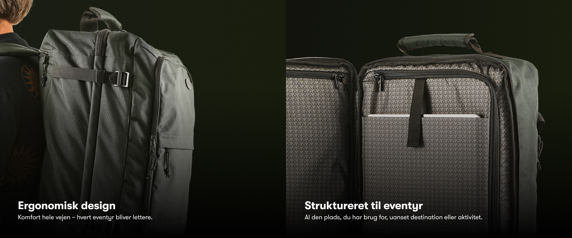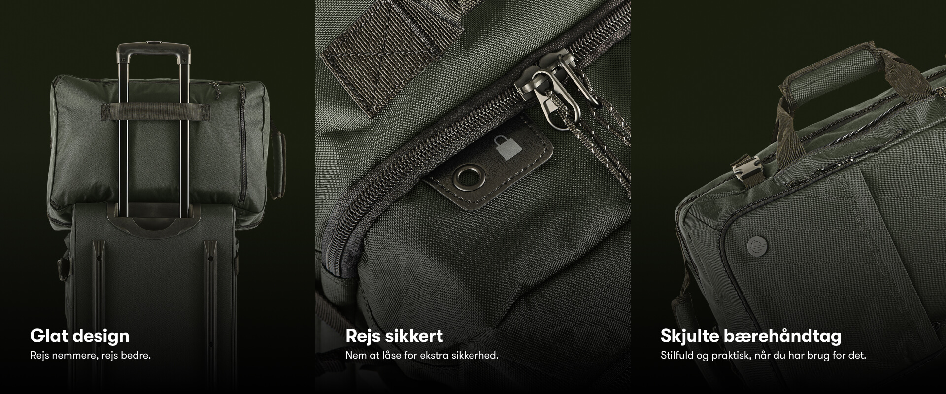 Skulderstropperne er designet til at være ergonomiske og gøre det lettere at håndtere rygsækken. Rygsækken kan også bæres som en dokumenttaske ved hjælp af sidehåndtagene. Både skulderstropperne og sidehåndtagene har separate rum, hvor de kan gemmes væk, når de ikke er i brug – hvilket gør det muligt at checke rygsækken ind. Derudover har rygsækken et praktisk tophåndtag samt en rem på bagsiden, som gør det nemt at fastgøre rygsækken til din kufferts teleskophåndtag.